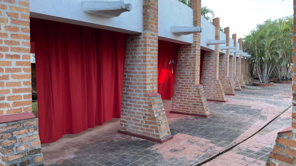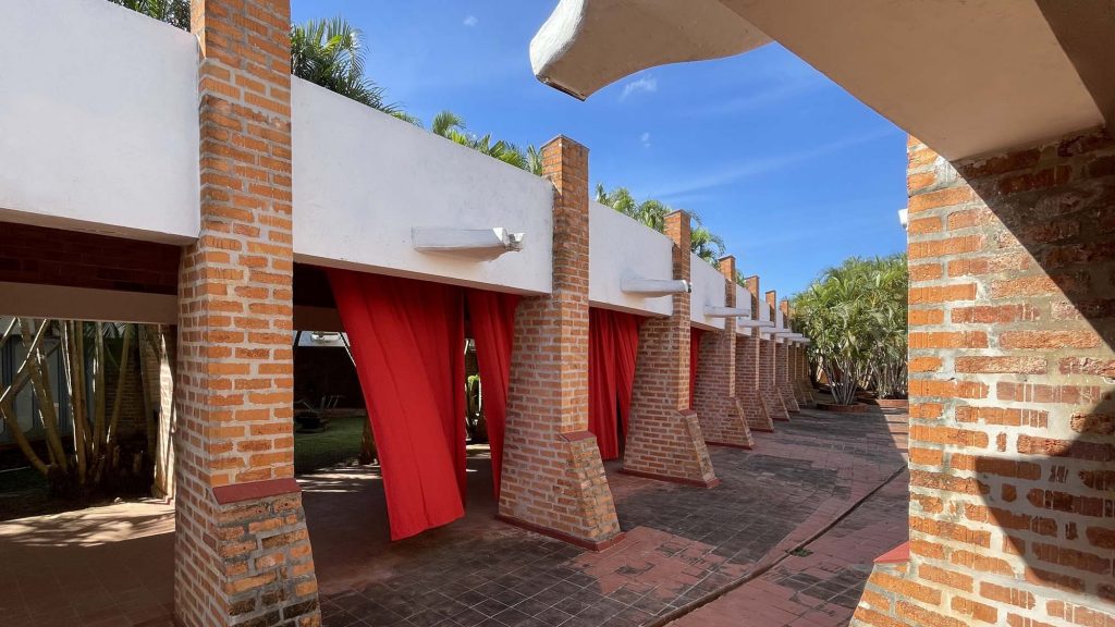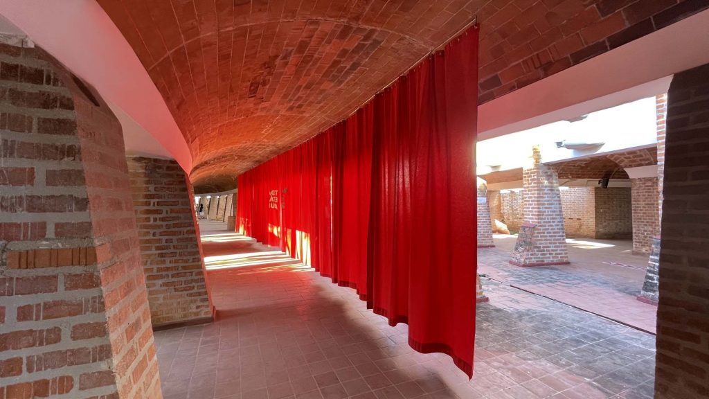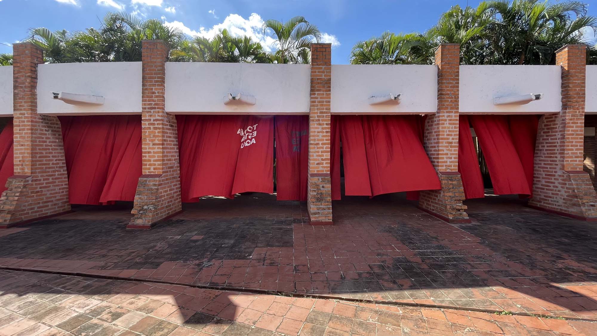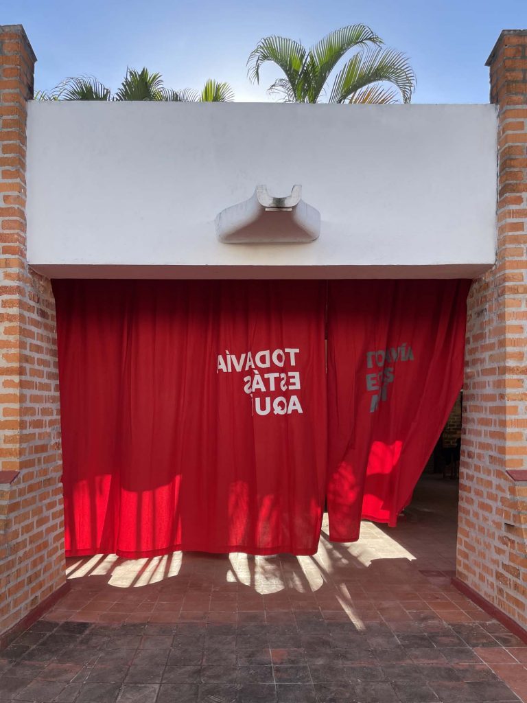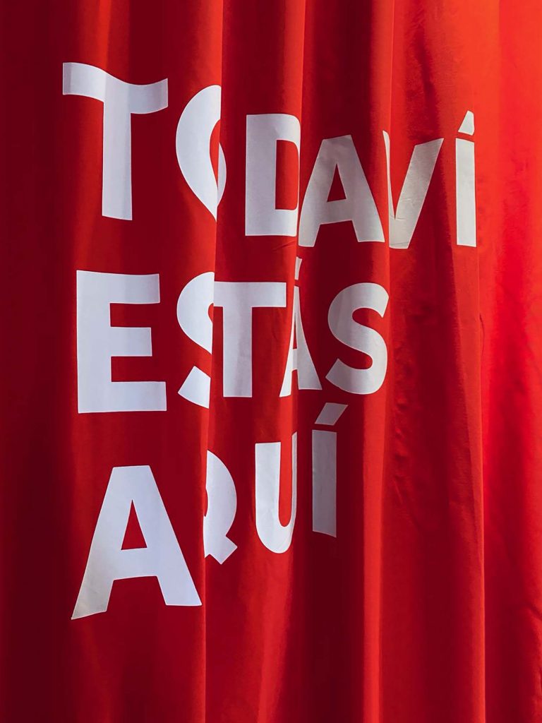 Correspondencias. TODAVÍA ESTÁS AQUÍ, 2024. Cortina de lona roja y vinilo textil. 300x14000cm.