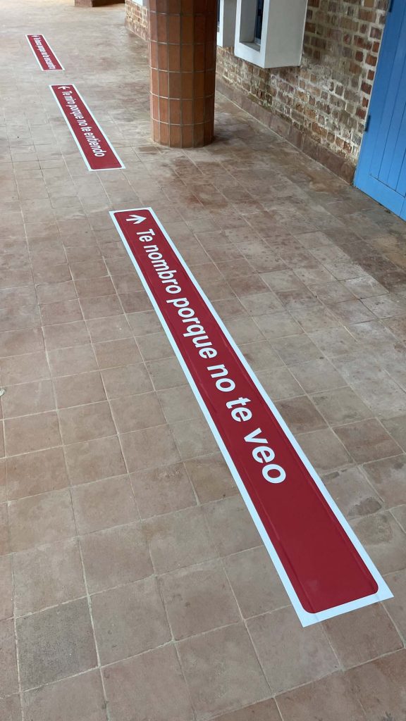The phrase YOU ARE STILL HERE occupies the central space of the installation. The staging of a red backdrop for the layout of the event is integrated into a dialogue with the series Trust Your Senses, made up of three signs that imitate the aesthetics of urban signs, with the texts: I name you because I don’t see you, I look at you because I don’t understand you and I look for you because I can’t find you. While the phrase You’re still here and its reflection propose a dichotomy between reality and space of representation, in order to redefine its function as a place for culture or art, the three phrases allude to the problematic relationship we have with the perception of reality through our senses, a constant theme in the history of thought and philosophy.