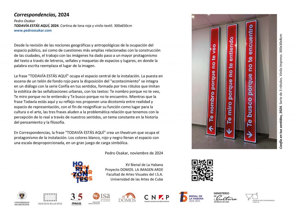 En Correspondencias, la frase TODAVÍA ESTÁS AQUÍ crea un theatrum que ocupa el protagonismo de la instalación. Los colores blanco, rojo y negro llenan el espacio con una escala desproporcionada, en un gran juego de carga simbólica.