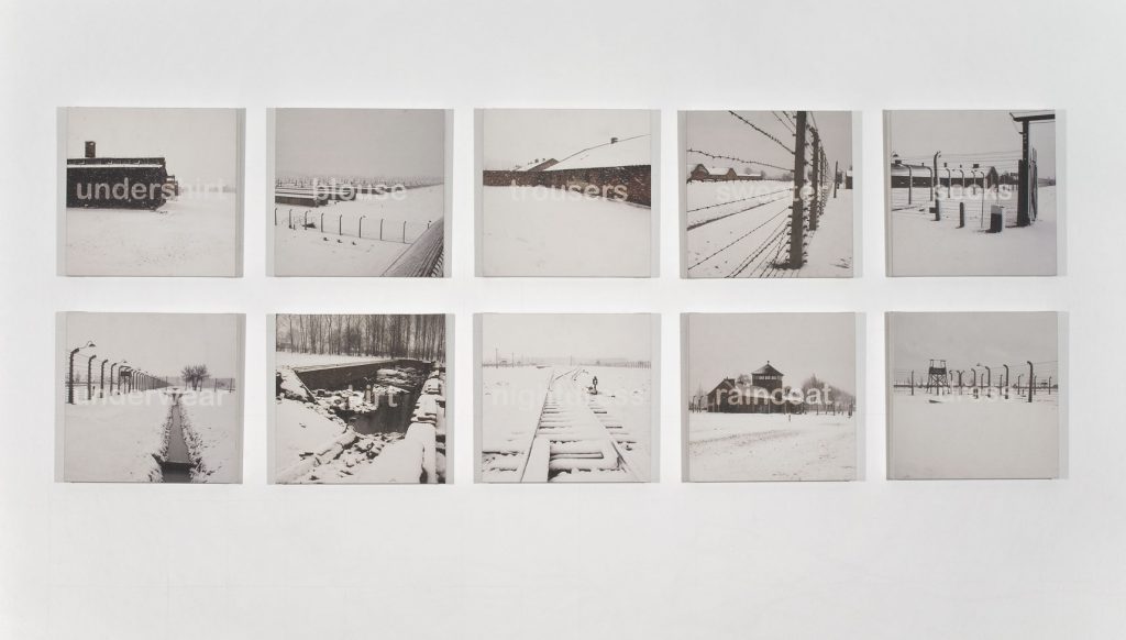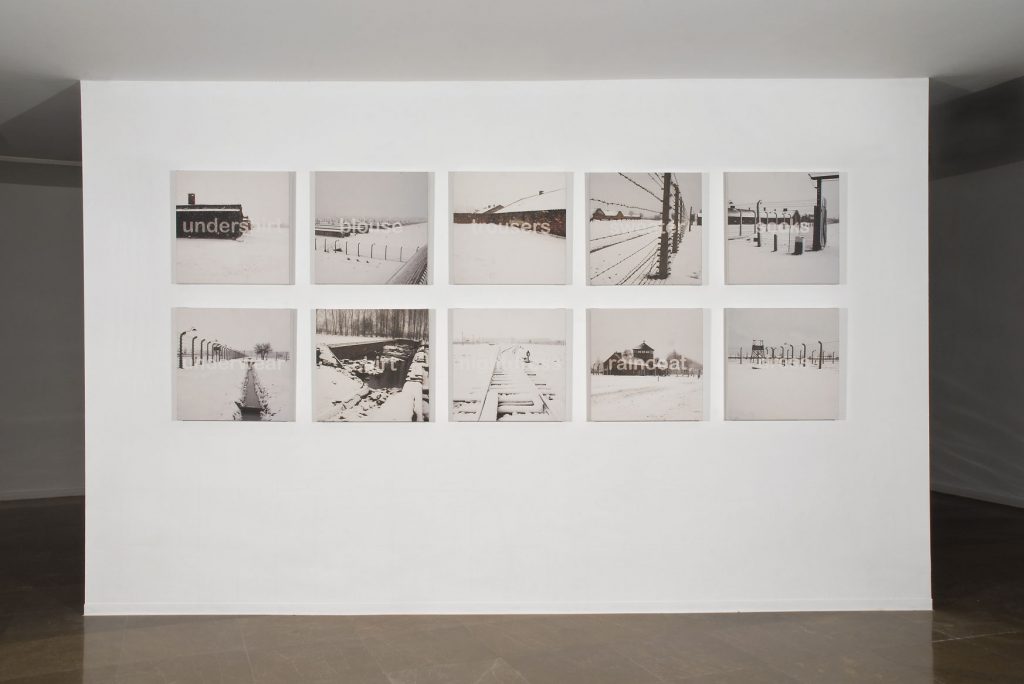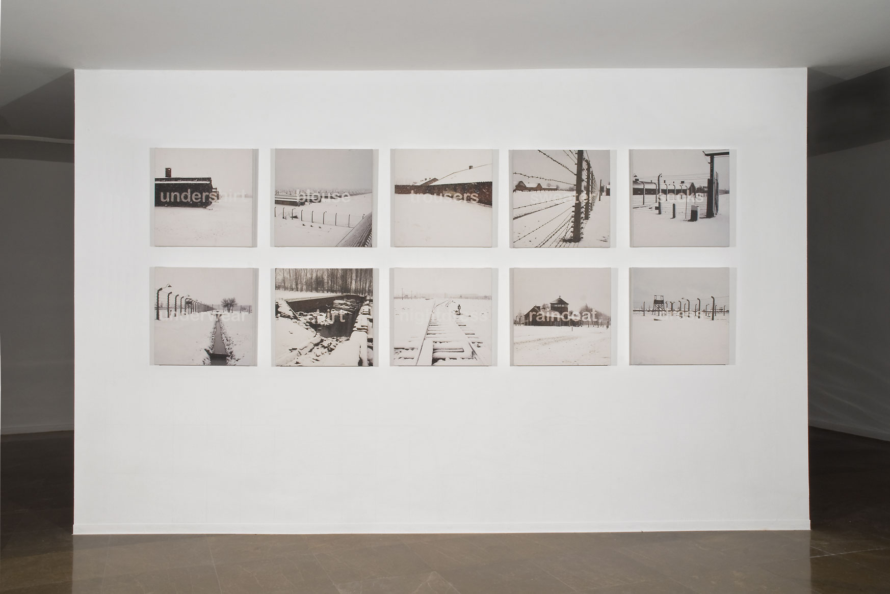 Partiendo de diez imágenes tomadas en 2005, durante la celebración del 60 aniversario de la Liberación de Auschwitz, se ha procedido a proponer una nueva lógica visual. Se ha borrado escrupulosamente cualquier presencia humana para suspender la temporalidad y crear un nuevo presente. La superposición de diez palabras que nos remiten a prendas de vestir de carácter íntimo, crean una constelación plena de tensiones con un presente políticamente cargado, dialécticamente polarizado, como un campo de fuerzas en el que se despliega el conflicto entre la historia previa y la posterior.