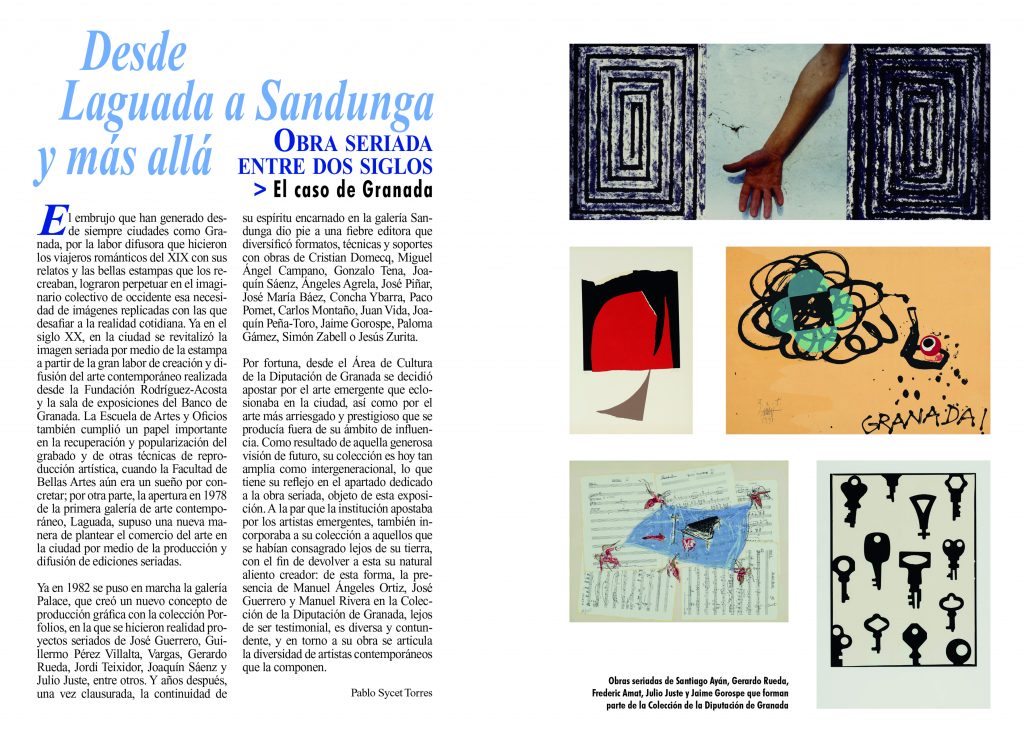 La exposición Desde Laguada a Sandunga y más allá. Obra seriada entre dos siglos. El caso de Granada recopila una nutrida selección de obra seriada creada al auspicio de instituciones y entidades fundamentales para el desarrollo de la cultura visual contemporánea en la ciudad de Granada. Con un repertorio abundante de artistas que de diversas formas han estado vinculados a esta ciudad, la muestra corrobora la fertilidad de la que goza el terreno de la producción seriada desde los años setenta del pasado siglo hasta nuestros días.