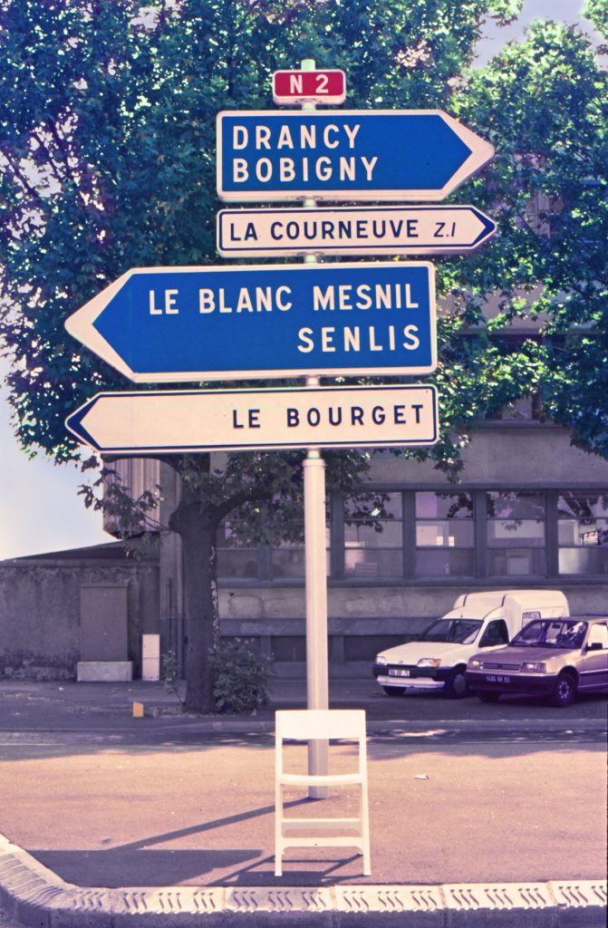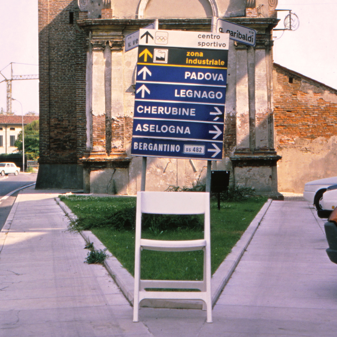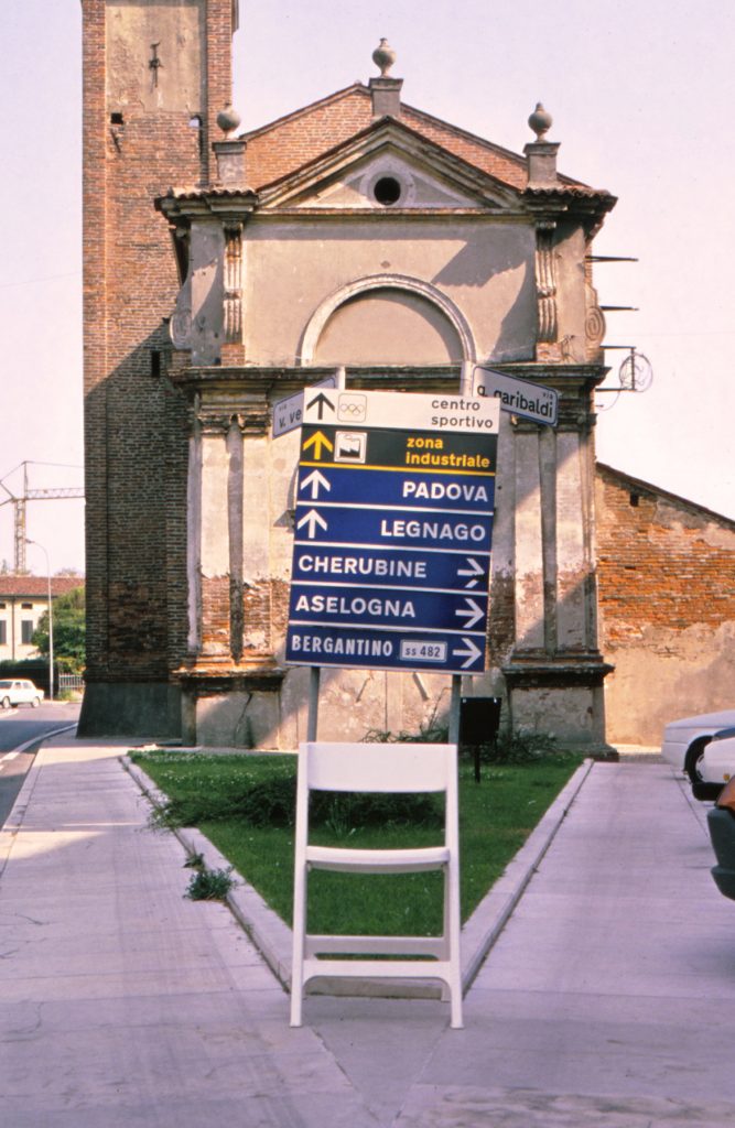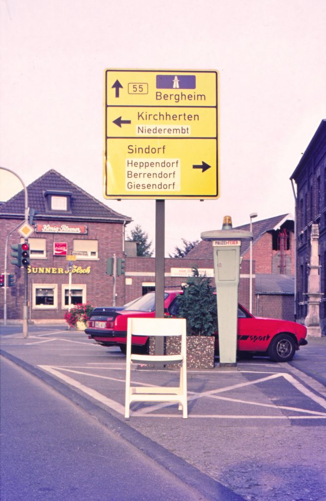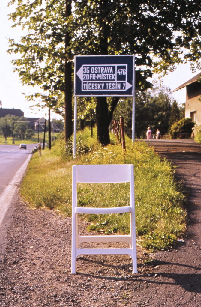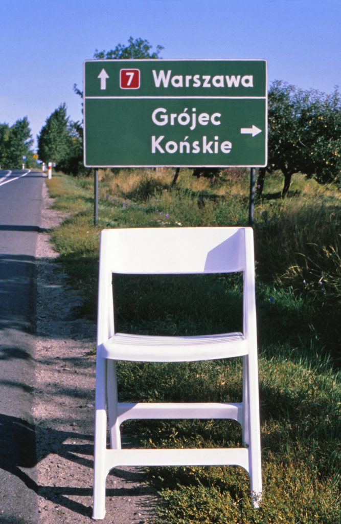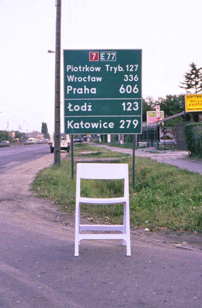 The Roundtrip Project, 1991. Granada-Krakow, is the photographic record of a journey between Granada and Krakovia. The white chair is an evidence of the lack of borders within Europe, of its cultural diversity and its shared sensitivity. The space and scale generated by the empty chair are the driving line of an exotic journey through the aesthetics of traffic signs and the different languages of each country: Spain, France, Italy, Austria, Czech Republic, Slovakia, Poland and Germany.