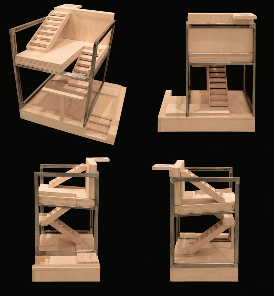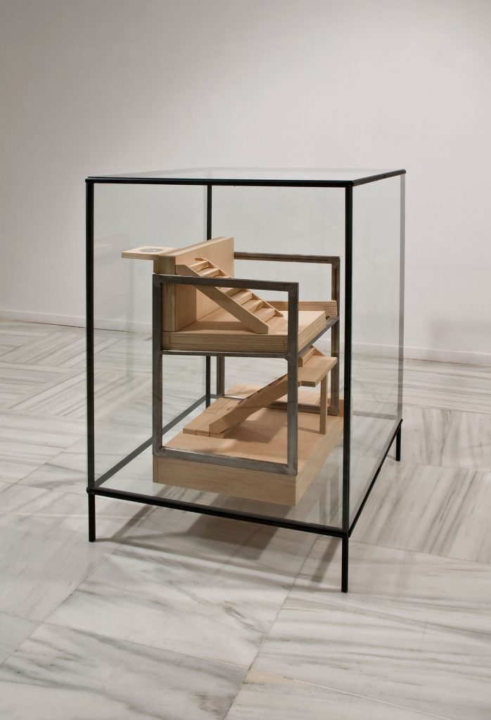 La casa de la doctrina, 2009. Vitrina de acero y cristal 130 x 90 x 90 cm Maqueta de madera sobre estructura de acero 82 x 70 x 63 y 50 x 70 x 75 cm