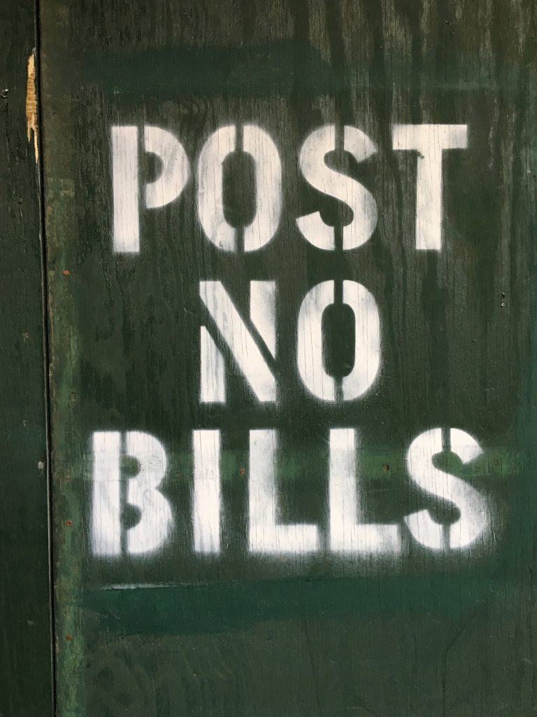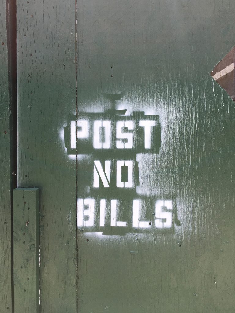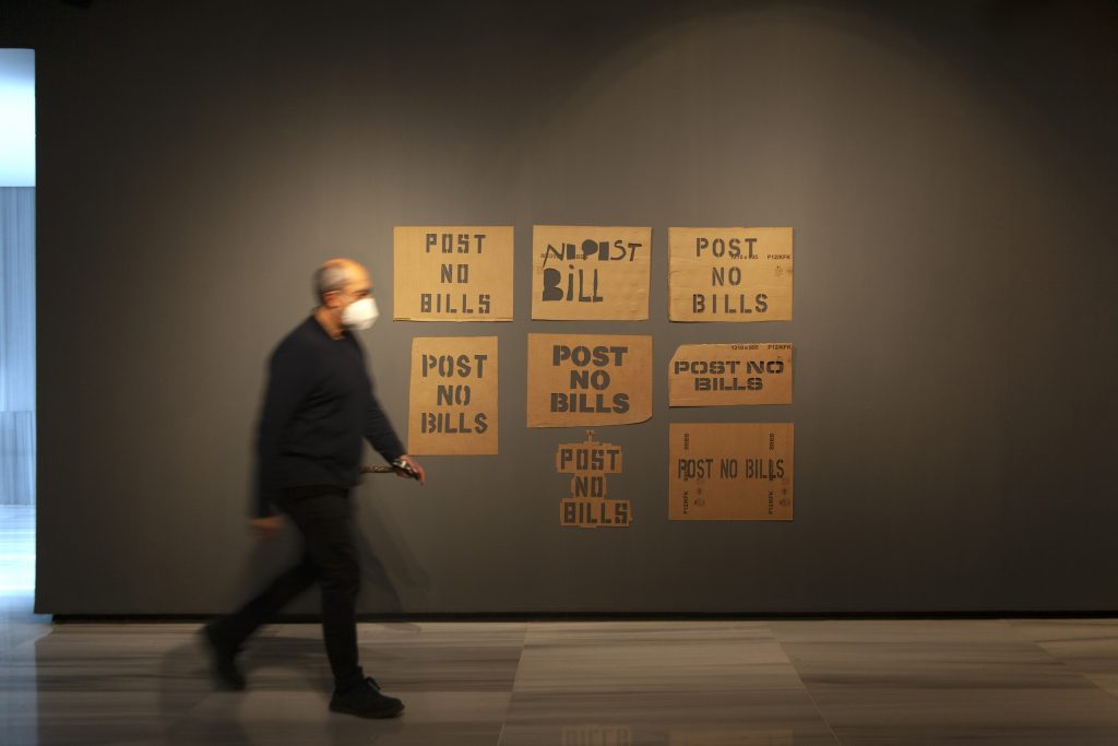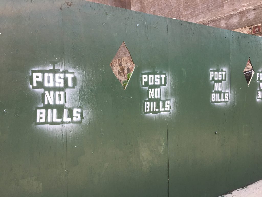 The images document the interventions carried out in different walls of works of the city of New York. It is normal for the walls of the works to be painted in a dark colour that is almost always green. The tradition is to paint with white spray and in a repetitive way the phrase: Post no bills. For days we toured the streets of Brooklyn and Queens, locating the walls that were erected to protect new building constructions. As an anonymous and absurd service, we went ahead and executed the work always with different templates that we had previously cut manually or with laser in 3mm grey cardboard. The series is not finished.