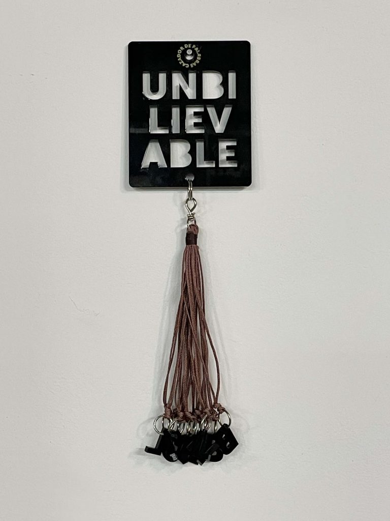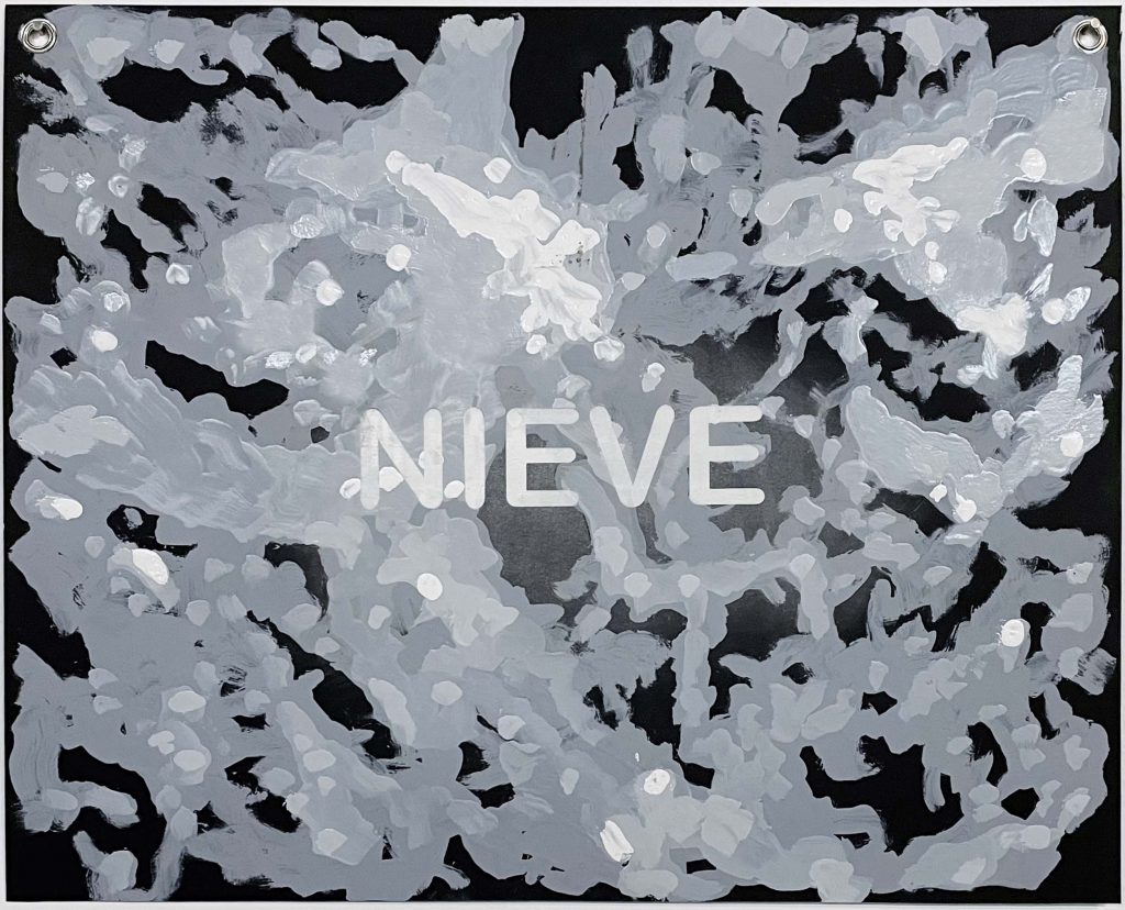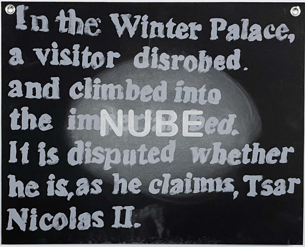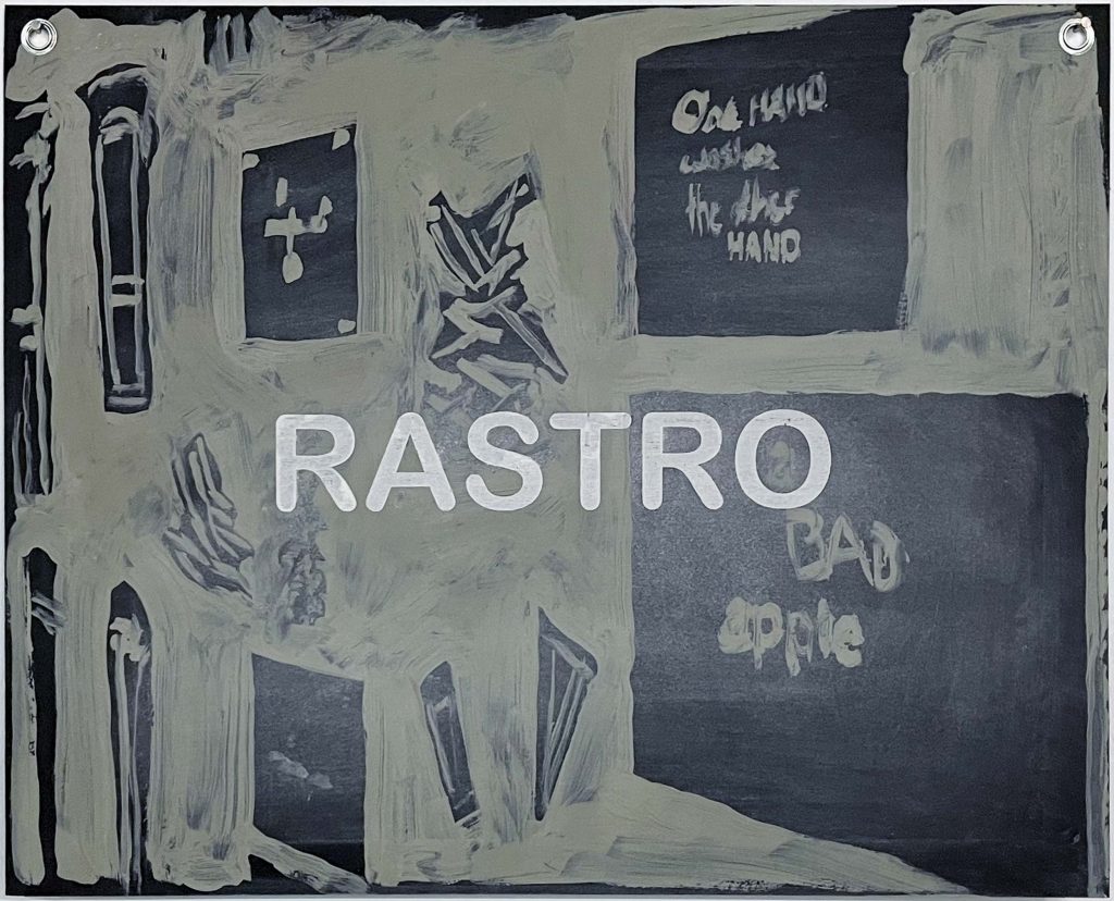 The Word Hunter is a project designed to establish an «alogical» game, randomly linking images and words. As a surrealist strategy, it involves creating templates of 12-letter words, grouped and stored in a canana (a hunter’s belt used to carry dead birds). From each 12-letter word—such as TRANSPARENT, REVOLUTIONS, UNBELIEVABLE—all possible words contained within are extracted. These discovered words are then layered over painted images on black cardboard. The resulting sense of order or disorder depends on the associations each viewer projects onto the set of images. The project generates an infinite archive of associations and cross-readings, where the hand, the eye, and the formal effects of each image take a secondary role, serving the overarching idea.