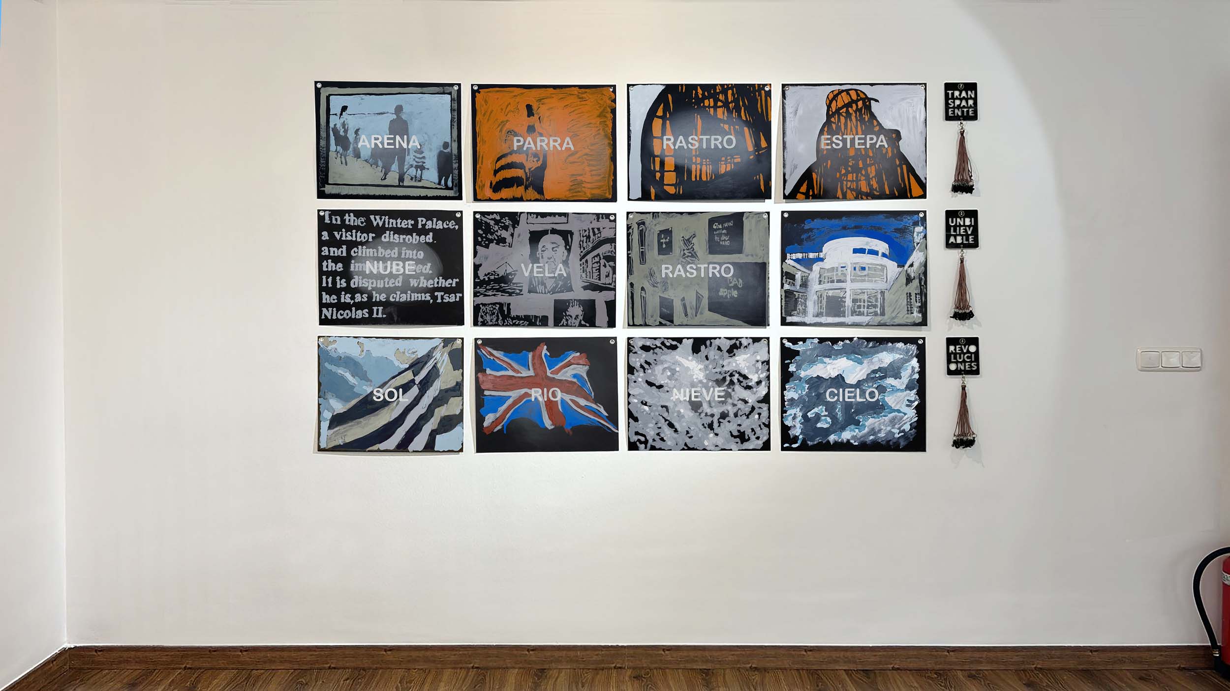 El Cazador de Palabras es un proyecto para establecer un juego «alógico» y relacionar aleatoriamente imágenes y palabras. Como una estrategia surrealista, a partir de la creación de plantillas de palabras de 12 letras agrupadas y recogidas en una «canana» (utensilio de los cazadores para guardar las aves muertas) se buscan todas las palabras contenidas en las doce letras de cada palabra: TRANSPARENTE, REVOLUCIONES, UNBILIEVABLE. A partir de este juego, las palabras halladas se superponen sobre las imágenes pintadas en cartón negro. El efecto de orden o desorden depende de las asociaciones que cada mirada proyecta sobre el conjunto de imágenes. El proyecto genera un archivo infinito de asociaciones y lecturas trasversales en las que la mano, el ojo y los efectos formales de cada imagen pasan a un segundo término para ponerse al servicio de la idea.